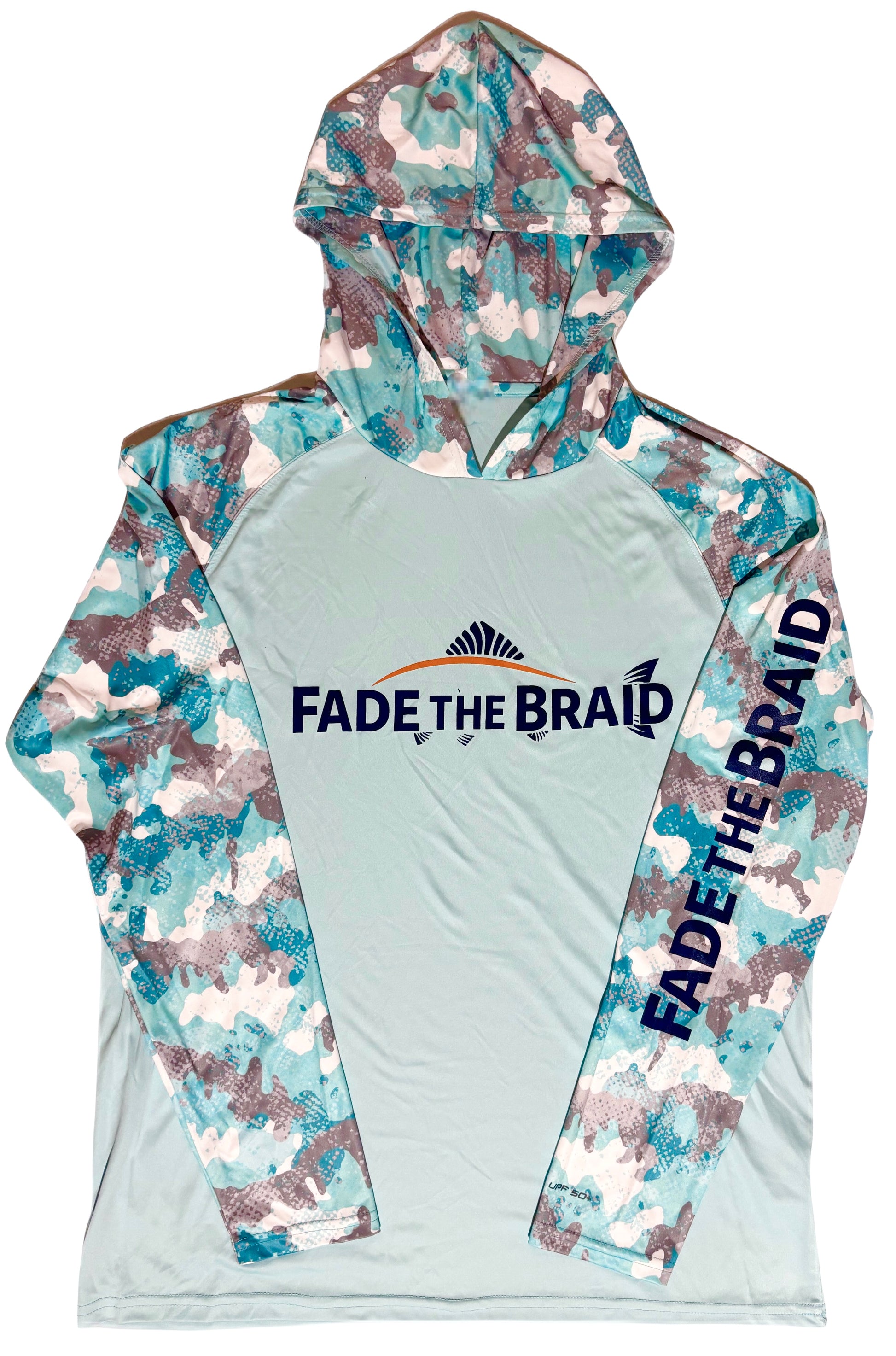 (XS-2XL)Fade the Braid Logo Long Sleeve Hooded Sun Shirt - Aqua Blue Camo UPF 50+ Odor/moisture management. Wrinkle resistant finish.